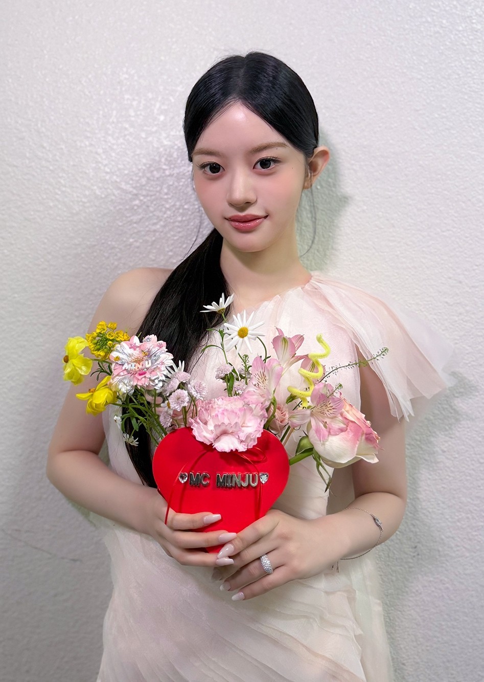 Minju began hosting Music Bank in October 2024, earning praise for her bright energy and steady delivery on live broadcasts. Alongside the weekly show, she also led the KBS Kpop YouTube web series Minju's Pink Cabinet and served as an MC for the 2025 KBS Song Festival, further proving her versatility.