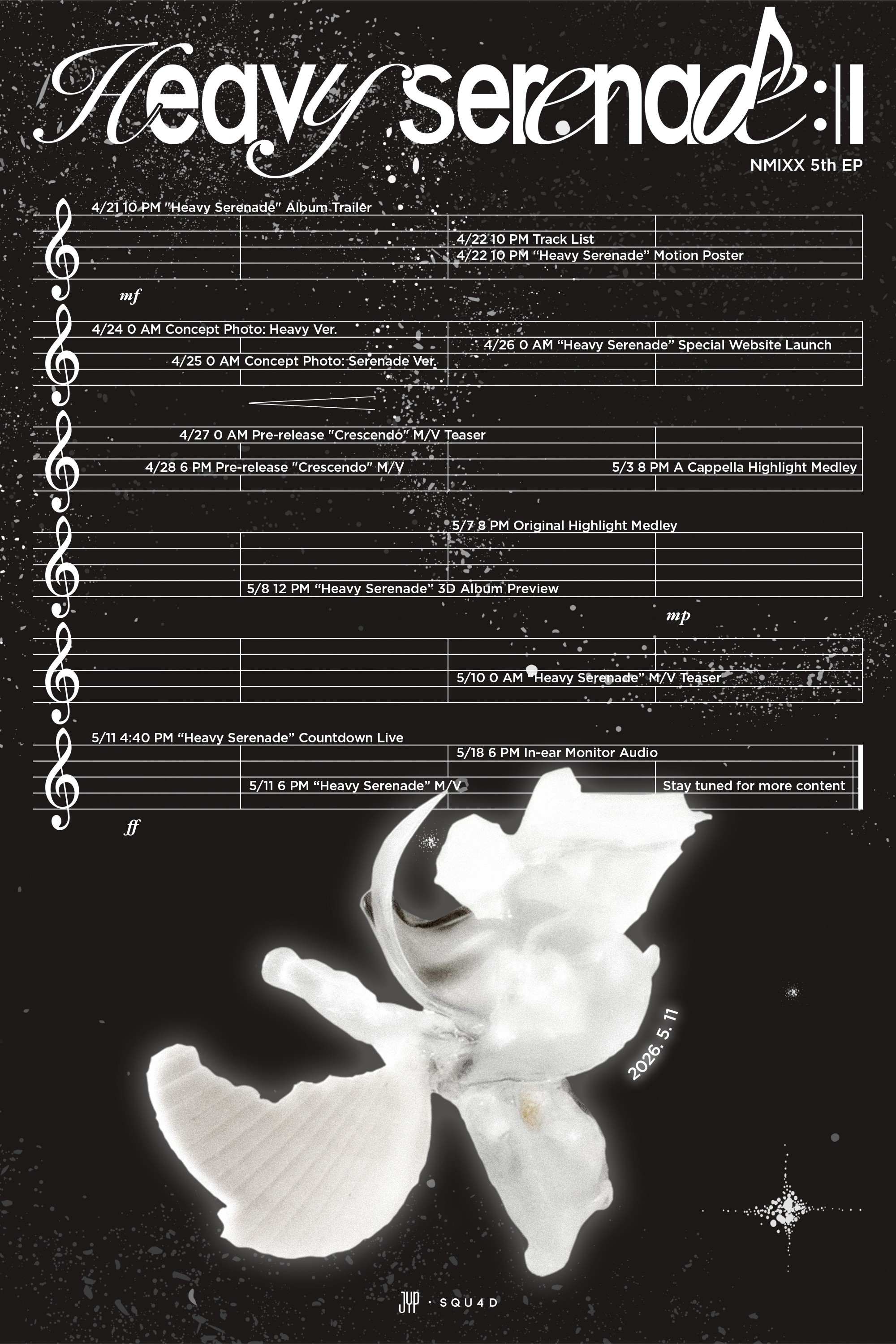 The promotion scheduler for the new album has been unveiled, hinting at a musical concept. Visual elements such as staff lines, treble clefs, notes, and musical symbols reflect the album's title, Heavy Serenade.